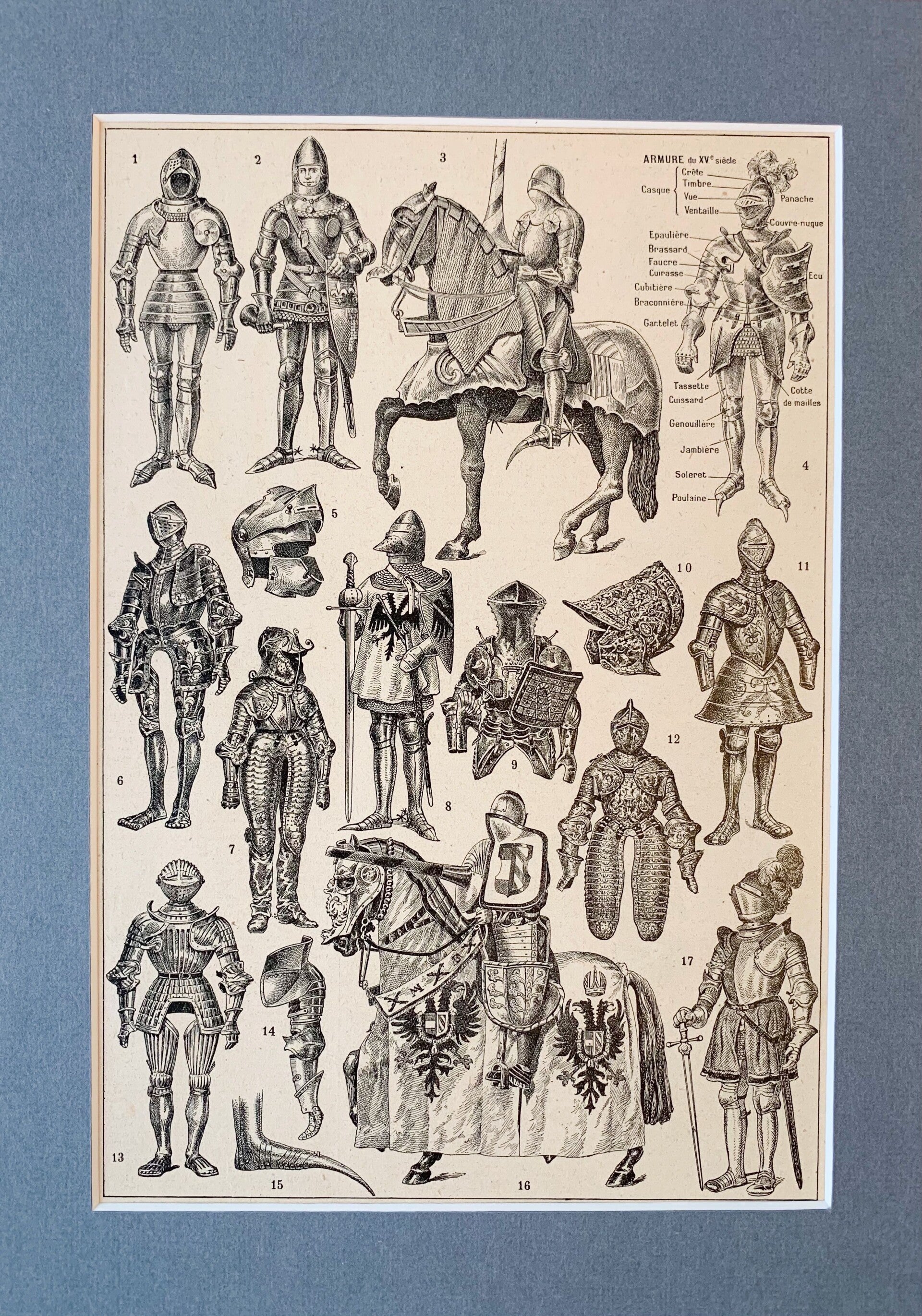 This fascinating plate, based on a steel engraving, is completely filled with many detailed illustrations of medieval knights' armour. The print originates from an antique French encyclopedia called 'Larousse Universel en 2 Volumes' from 1922.