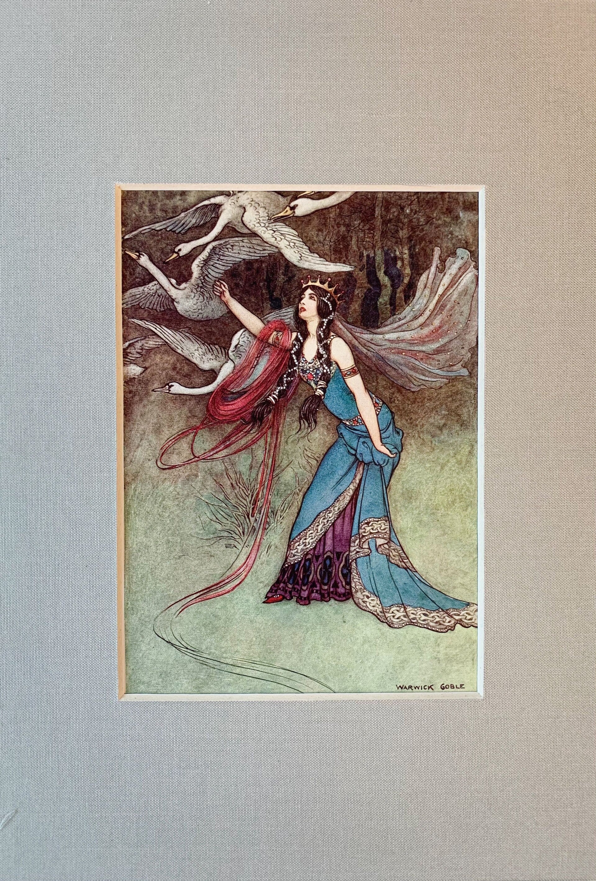 Easily style your kid's room with this exquisite tipped-in coloured plate with vibrant colours and incredible detail. This plate depicts the story of "The Six Swans" and was made by Warwick Goble.